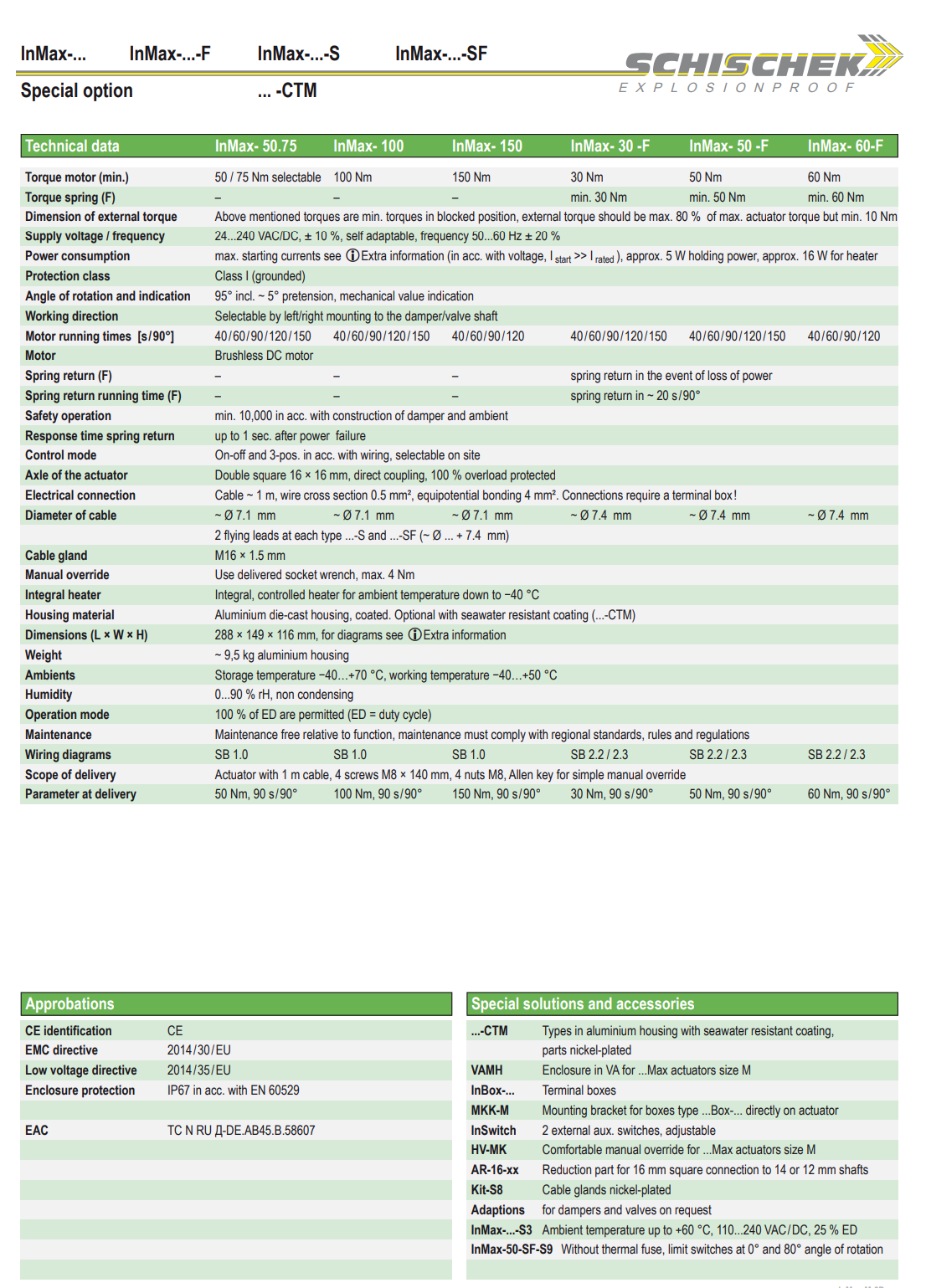 Red(RedMax)防爆,用于2区、22区的气体+粉尘认证;In(InMax)用于安全区域。选项包括弹簧复位故障安全、不锈钢外壳、低温度环境和 offshore/海洋涂层集成加热器。