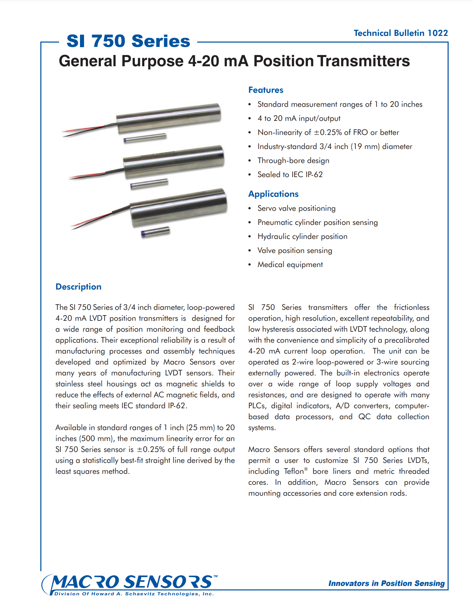 SI 750 系列 3/4 英寸直径、回路供电 4-20 mA LVDT 位置发送器专为各种位置监控和反馈应用而设计。