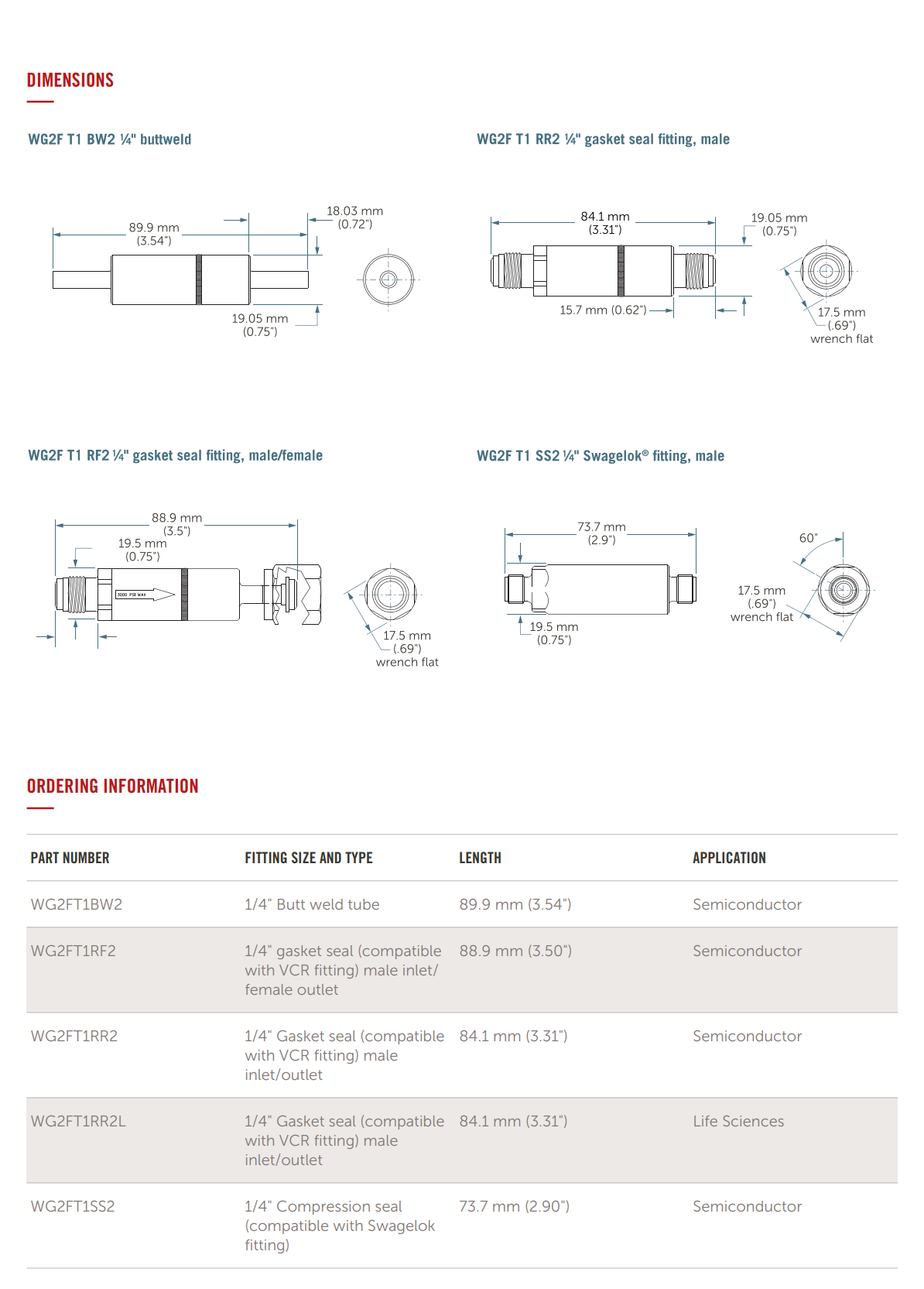 WG2FT1RF2 1/4" 垫密封 (兼容VCR接头) 阳口进/阴口出 88.9 毫米 (3.50英寸) 半导体