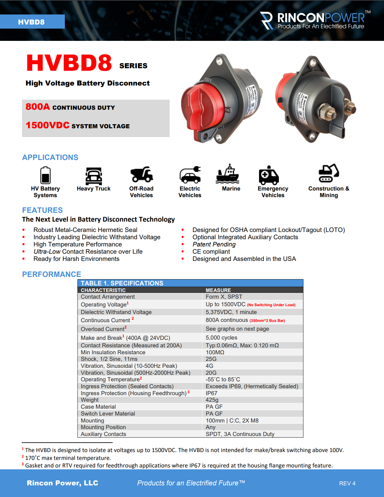 Rincon Power 的高压电池断开装置 (HVBD) 是手动安全断开 (MSD) 开关,专为在工业设备、储能系统和电动汽车等应用中的维护或存储期间隔离高压电池组而设计。旋转开关手柄确保安全断电,并与常见的 OSHA 锁定/悬挂 (LOTO) 程序兼容。在“开启”位置,该设备提供超低接触电阻,能够在紧凑的外形中承载 impressive 的电流;而在“关闭”位置,则提供行业领先的介电性能,有效隔离高达 1500V 的电压。